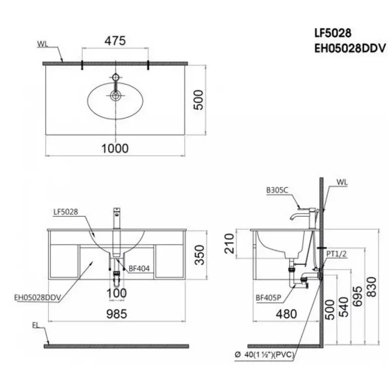 - KT lavabo LF5028 : 500x 1000 x 15 mm (dài x rộng x cao)