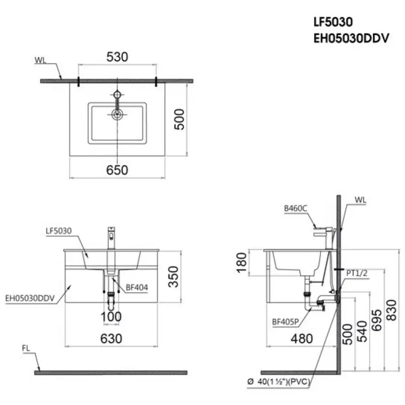 - Kích thước lavabo: 500 x 650 x 180 mm (dài x rộng x cao)