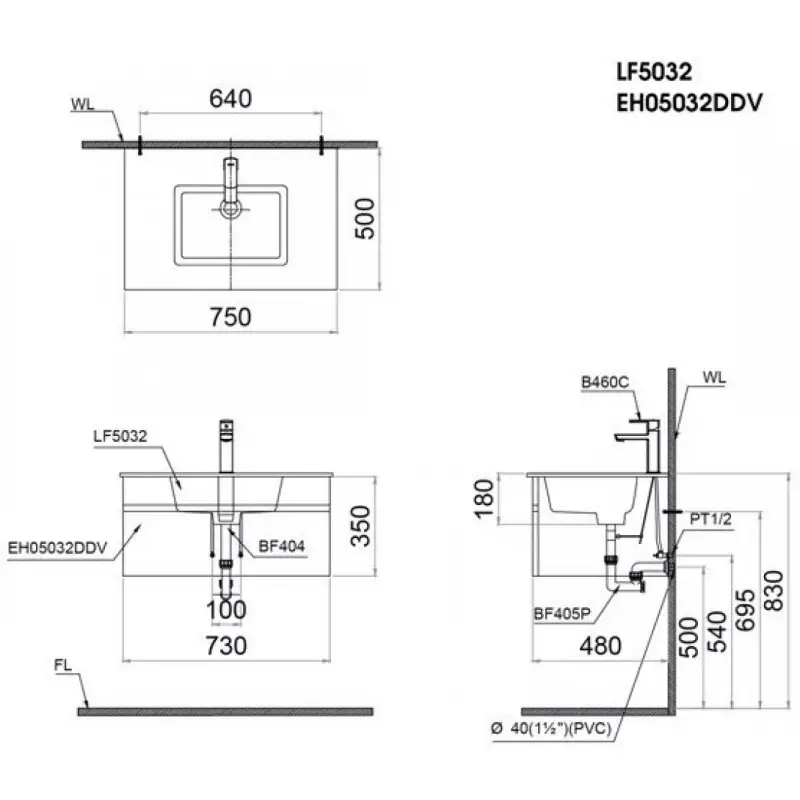 - Kích thước lavabo LF5032:500 x 750 x 180 mm (dài x rộng x cao)