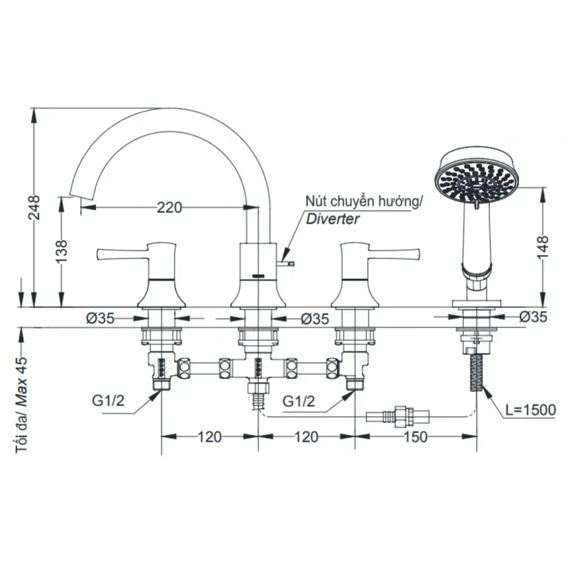 - Tích hợp bát sen cầm tay tiện lợi: Điểm khác biệt lớn nhất so với dòng 3 lỗ là sự xuất hiện của lỗ thứ 4 dành cho bát sen cầm tay (Handshower). Dây sen thường được thiết kế rút ẩn dưới gầm bồn, giúp người dùng dễ dàng kéo ra để tắm tráng hoặc vệ sinh bồn tắm sau khi sử dụng, mang lại sự linh hoạt tối đa.