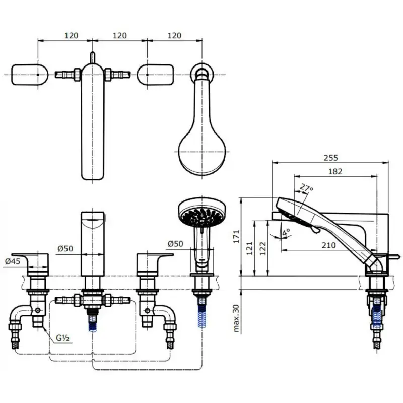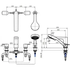 - Lắp đặt: Gắn thành bồn tắm 4 lỗ.