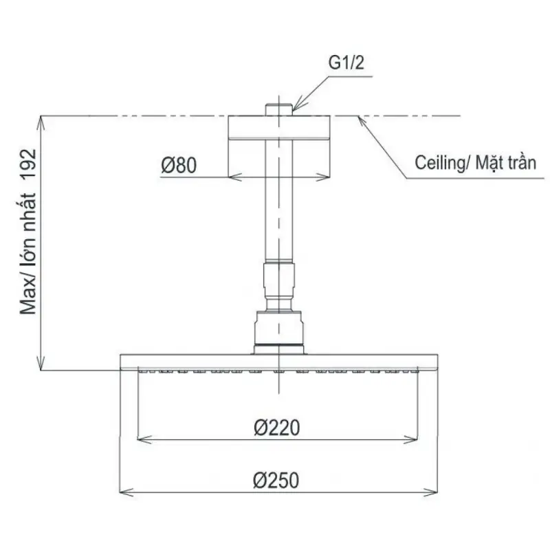 - Kích thước: 250mm (Xem chi tiết ở phần hướng dẫn lắp đặt).