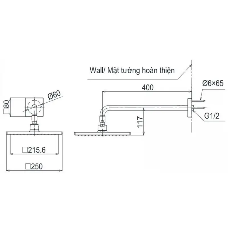 - Kích thước: 250mm (Xem chi tiết ở phần hướng dẫn lắp đặt).