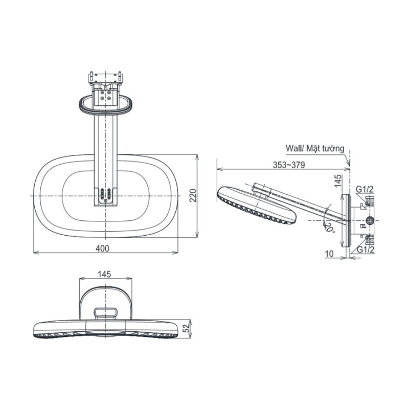 - Kích thước: 400×230 mm (Xem chi tiết ở phần hướng dẫn lắp đặt).