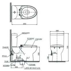 - Cấu tạo: Thân cầu (C320R), Két nước (S325D), Nắp bồn cầu (TC395VS).