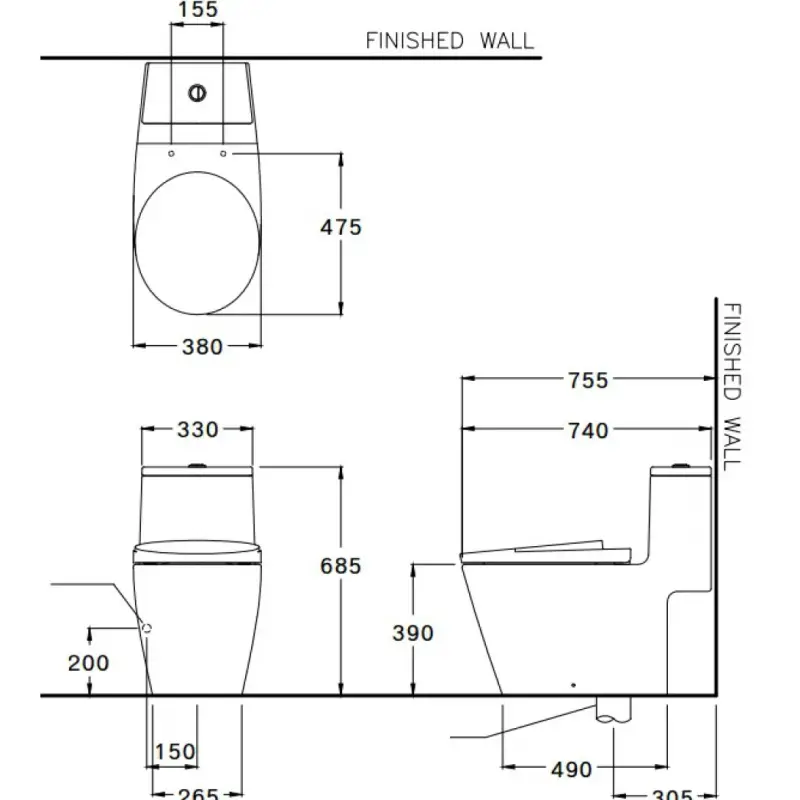 - Kích thước: 755 x 330 x 685 mm (Xem chi tiết ở phần hướng dẫn lắp đặt).
