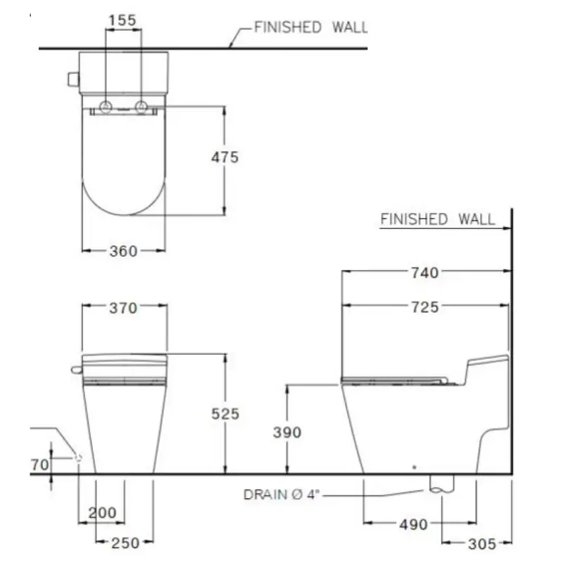 - Kích thước: 725 x 370 x 525 mm (Xem chi tiết ở phần hướng dẫn lắp đặt).