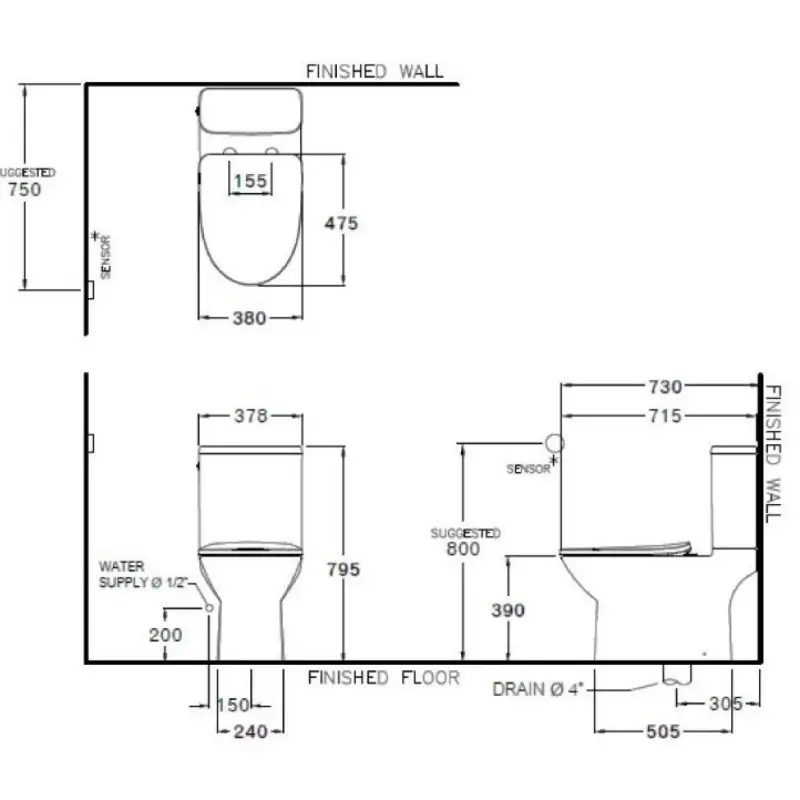 - Kích thước: 380 x 715 x 795 mm (Xem chi tiết ở phần hướng dẫn lắp đặt).