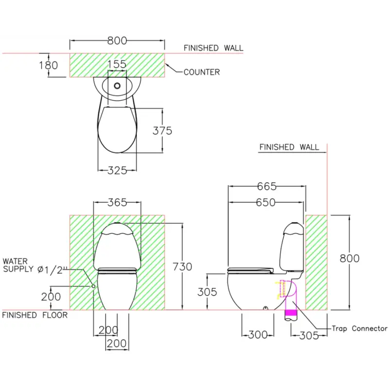 - Kích thước: 365 x 650 x 730 mm (Xem chi tiết ở phần hướng dẫn lắp đặt).