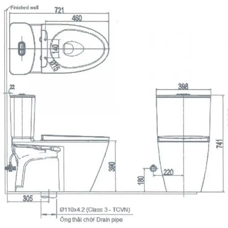- Kiểu xả: Nhấn 2 mức 4.5L/3.0L.