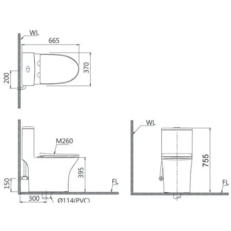 - Tâm thoát: 300mm