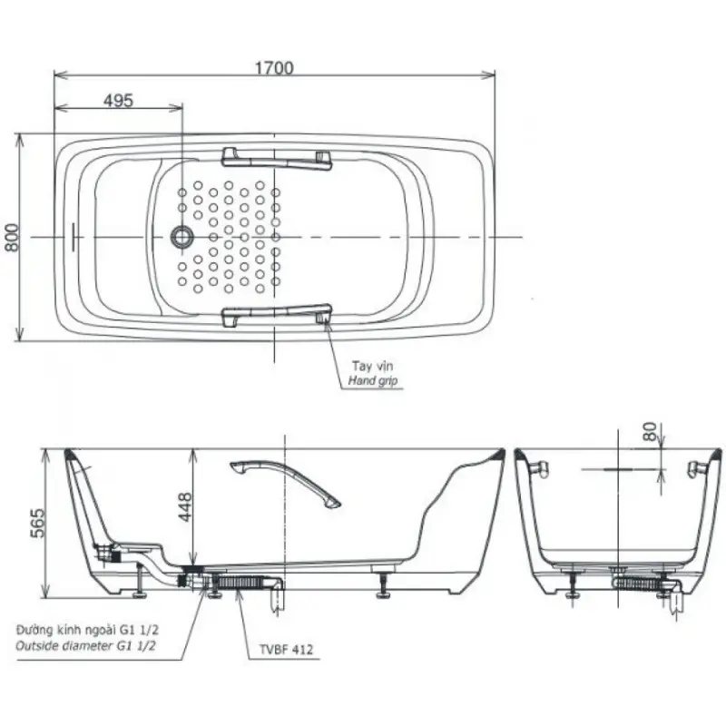 - Kích thước: 1700x800x565mm (Xem chi tiết ở phần hướng dẫn lắp đặt).