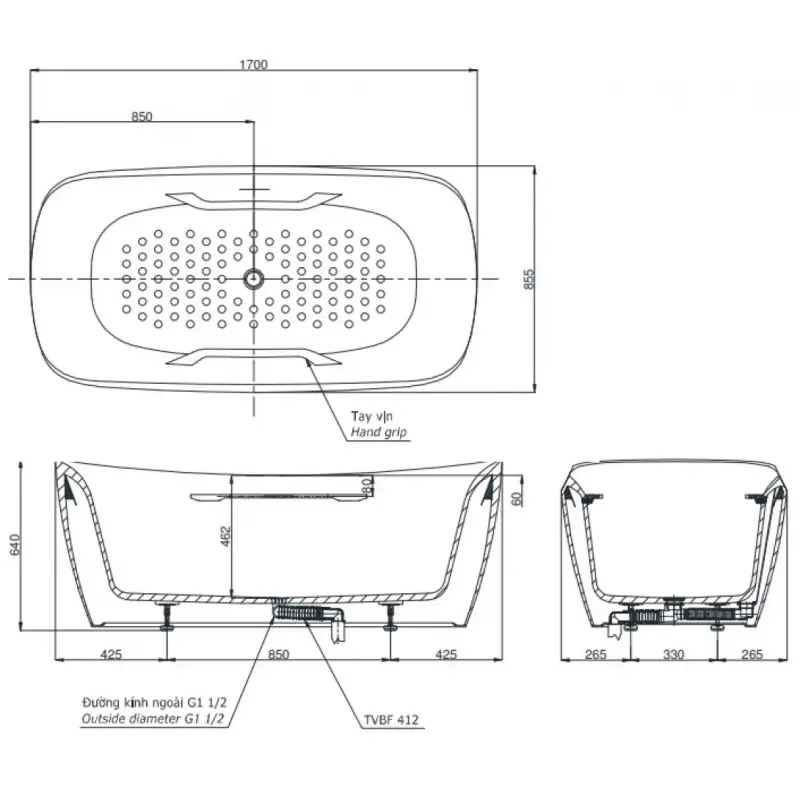 - Kích thước: 1700x885x640mm (Xem chi tiết ở phần hướng dẫn lắp đặt).