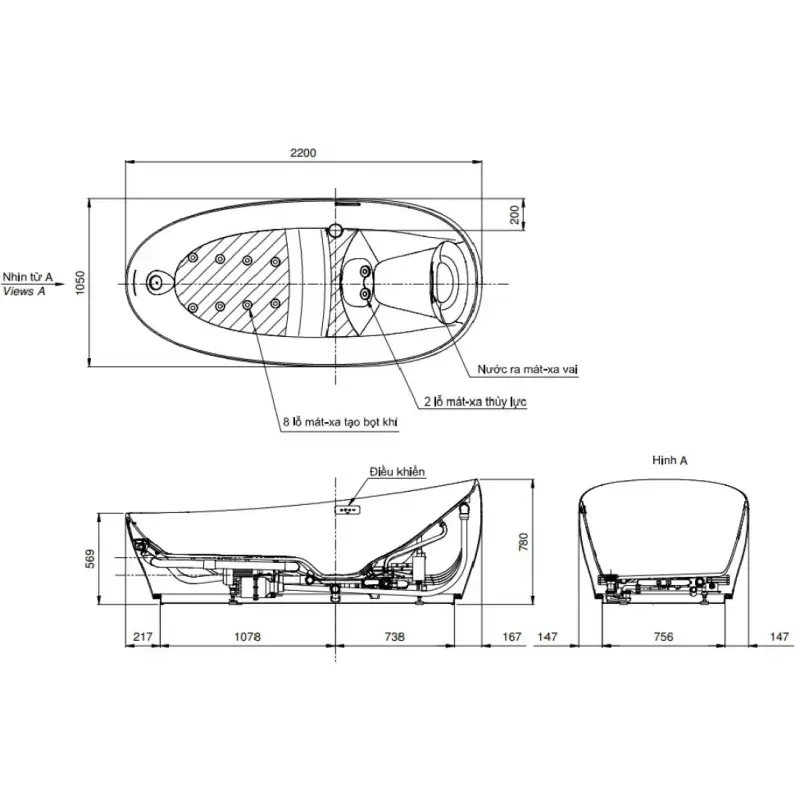 - Bồn tắm đặt sàn massage sục khí, đèn LED.