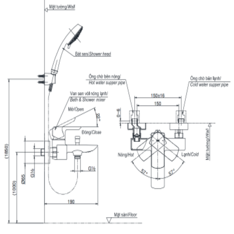 - Áp lực nước: 0.15MPa ~ 0.75MPa.