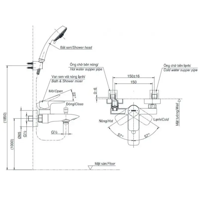 - Áp lực nước: 0.15MPa ~ 0.75MPa.