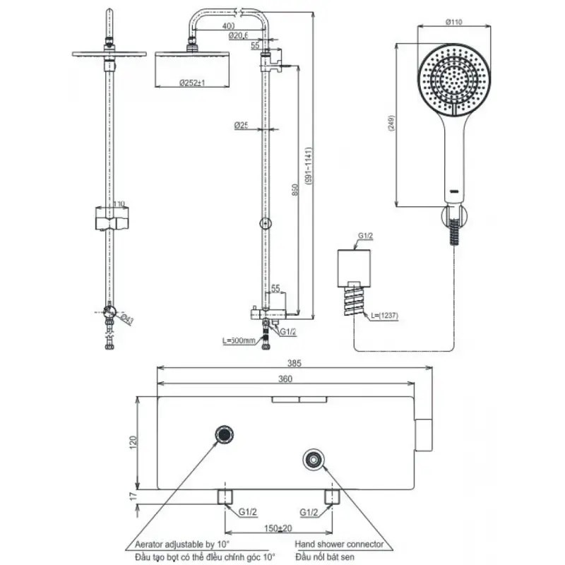 - Trải nghiệm bát sen Aerial Shower: Bằng cách hòa trộn không khí vào nước, bát sen cây tạo ra các hạt nước lớn, nặng và êm ái hơn. Công nghệ này giúp tiết kiệm nước tối ưu mà vẫn mang lại cảm giác tắm sảng khoái như dưới cơn mưa tự nhiên.