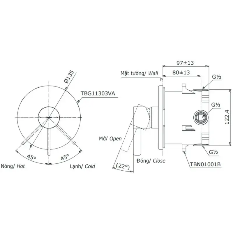 - Van điều nóng lạnh, kèm phụ kiện âm tường.