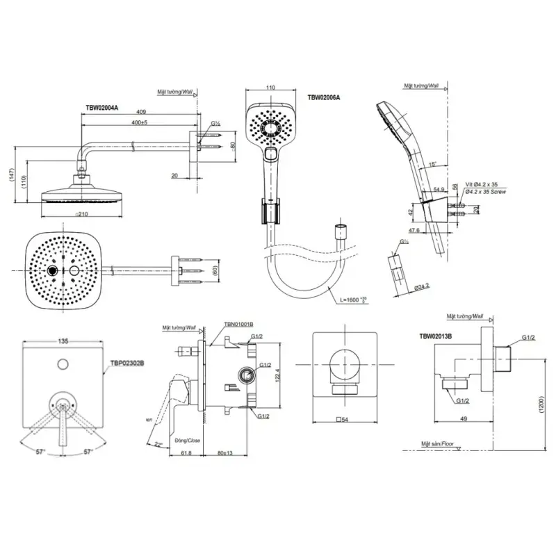Thông Số Kỹ Thuật Chi Tiết Của Sen Tắm Toto TBP02302B/TBW02004A/TBW02006V: