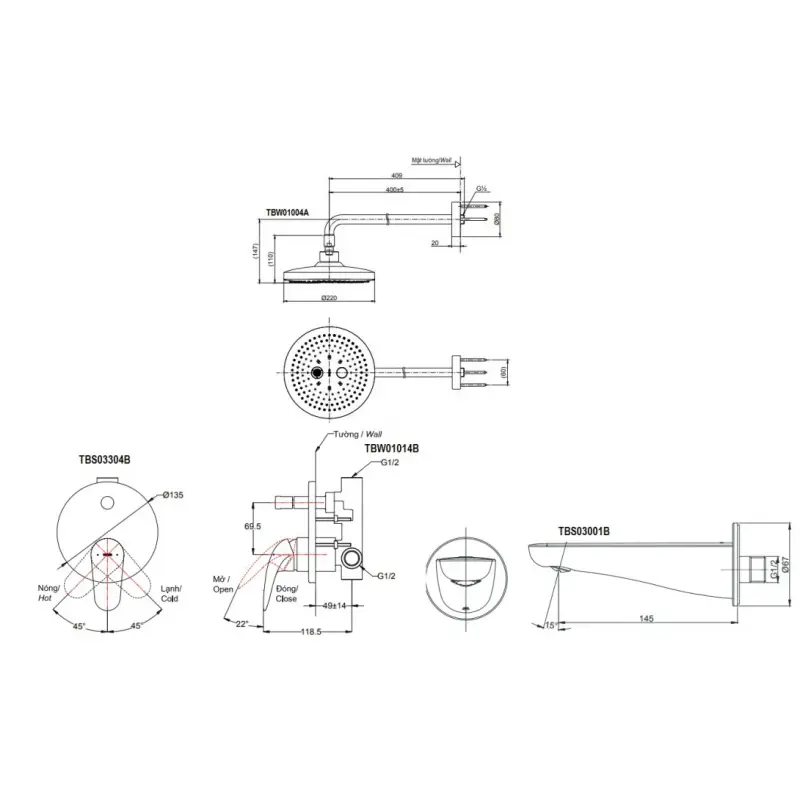 - Mọi thông số kỹ thuật của sen tắm đồng thau TBS03304B + TBW01004A + TBS03001B mang tính khách quan có thể có sai số của công cụ đo lường.