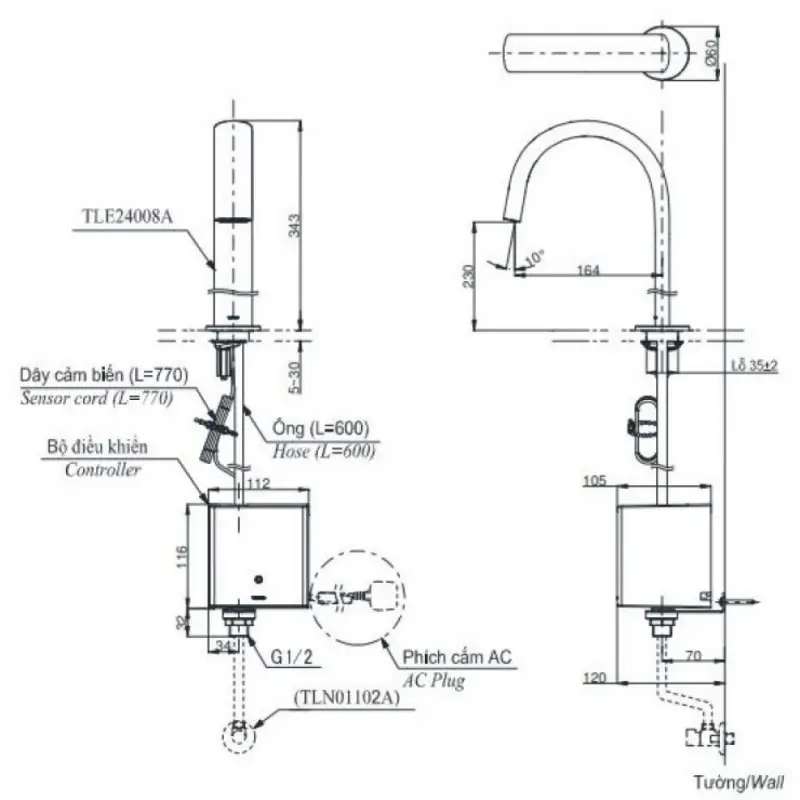 Thông Số Kỹ Thuật Chi Tiết Của Vòi Cảm Ứng Toto TLE24008V/TLE04502A1/TLN01102A: