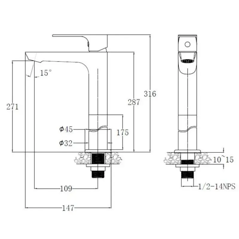 - Kich thước Chiều cao đầu vòi H1: 316 mm