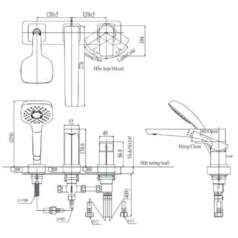 - Lắp đặt: Gắn thành bồn tắm 3 lỗ.