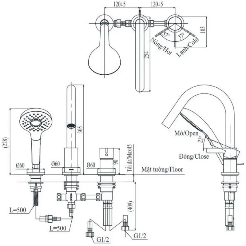 - Thiết kế 3 bộ phận sang trọng, bề thế: Khác với vòi gật gù đơn khối, thiết kế 3 lỗ trải rộng trên thành bồn tạo cảm giác rộng rãi, cân xứng và đậm chất “hoàng gia”, biến khu vực bồn tắm thành tâm điểm của sự xa hoa.