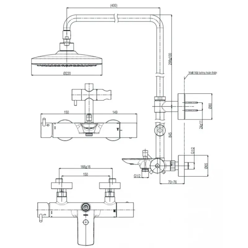 - Kích thước: 220mm (Xem chi tiết ở phần hướng dẫn lắp đặt).