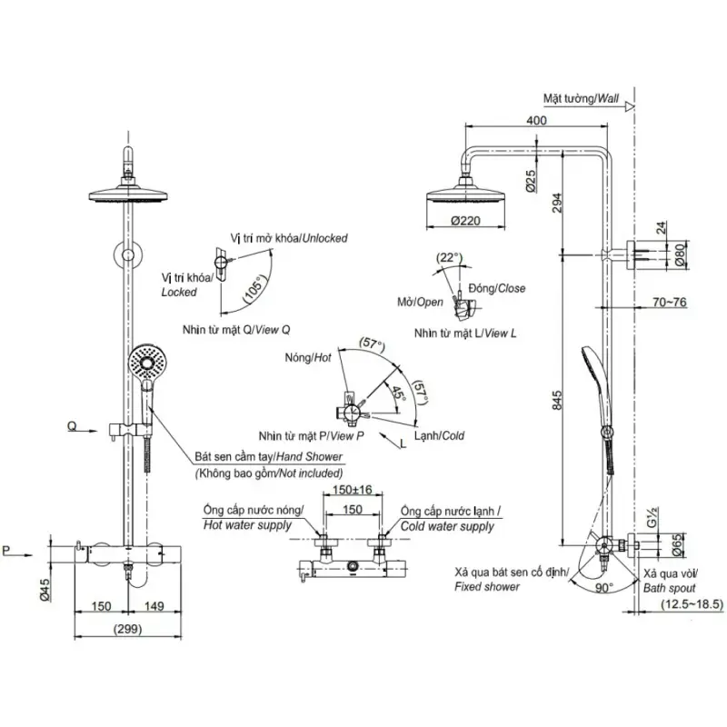 - Kích thước: (Xem chi tiết ở phần hướng dẫn lắp đặt).