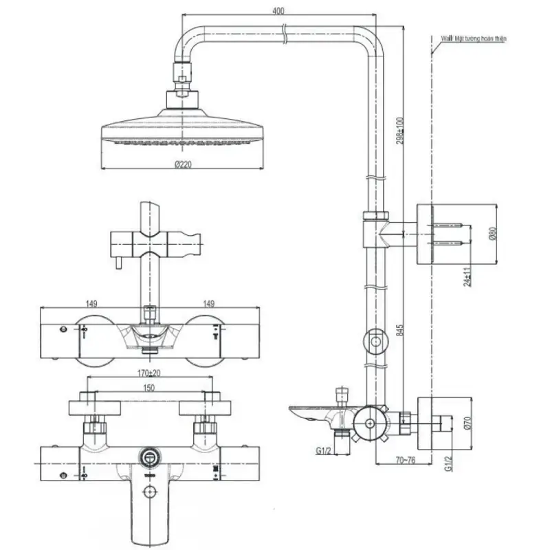 - Kích thước: (Xem chi tiết ở phần hướng dẫn lắp đặt)