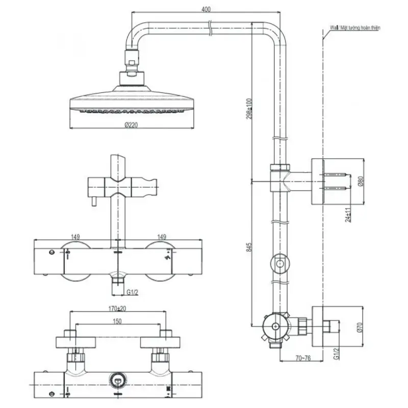 - Kích thước: 220mm (Xem chi tiết ở phần hướng dẫn lắp đặt)