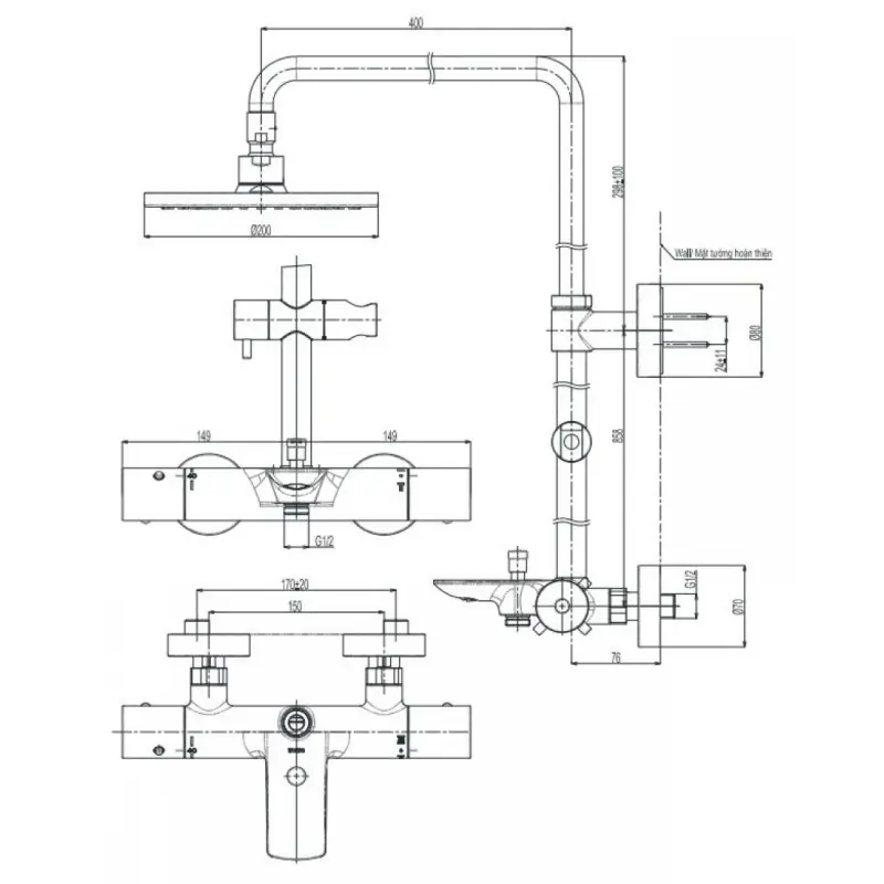 - Kích thước: 200mm (Xem chi tiết ở phần hướng dẫn lắp đặt)