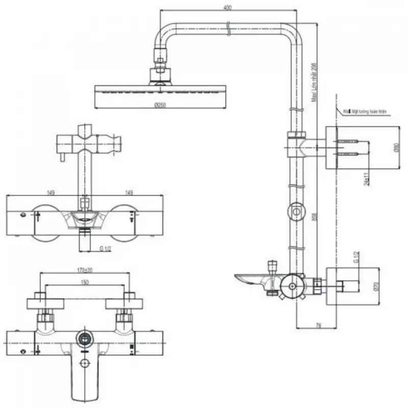 - Kích thước: 250mm (Xem chi tiết ở phần hướng dẫn lắp đặt)