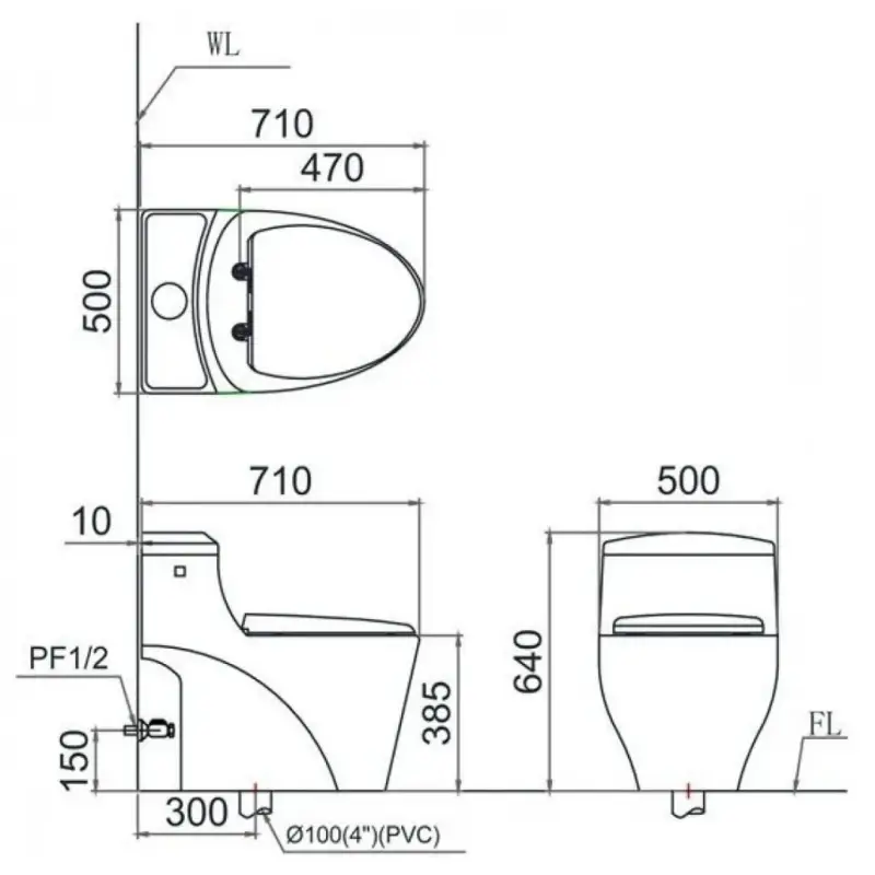 - Tâm thoát phân: 300 mm