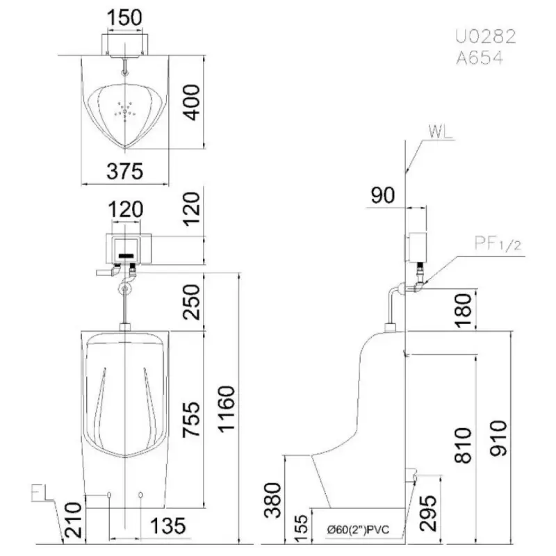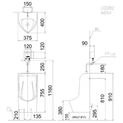 - Bồn tiểu U0282 có thể lắp đặt với các van xả tiểu sau: BF412G, A652DC, A623, A624, A637, A648…