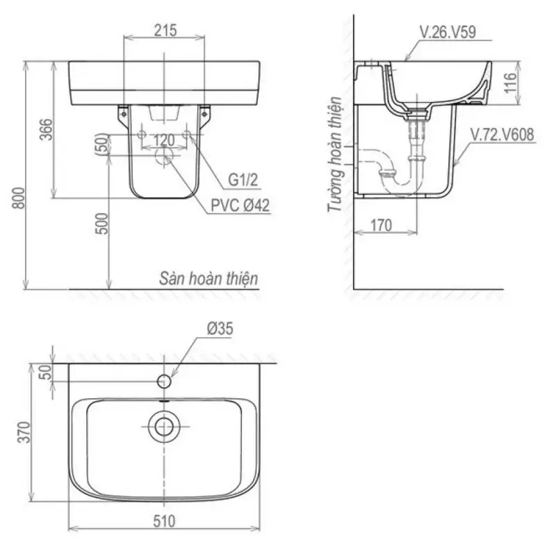 Thông Số Kỹ Thuật Chi Tiết Của Bộ Chậu Rửa Lavabo Viglacera V59 Treo Tường: