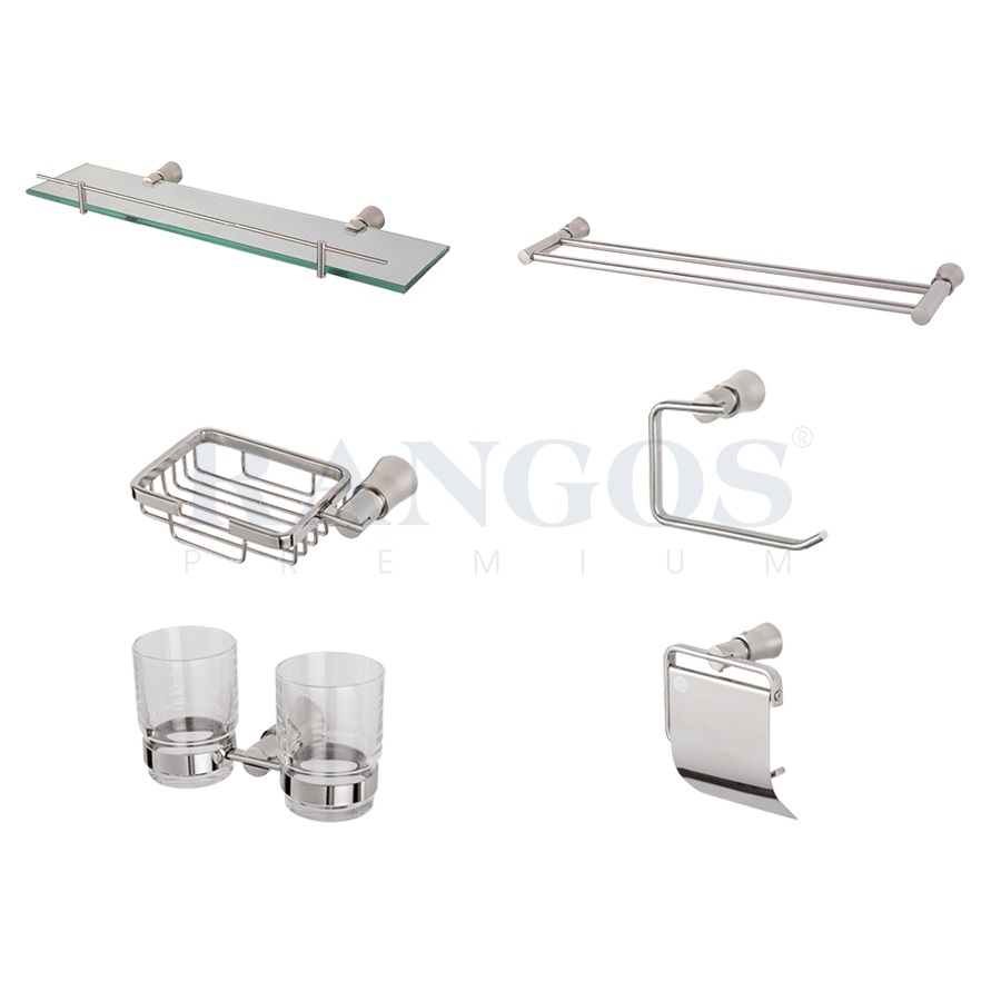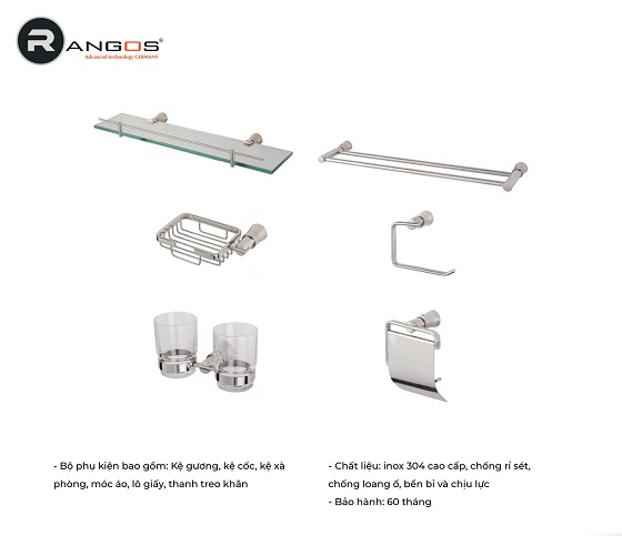 Bộ sản phẩm gồm: Kệ gương, thanh vắt khăn, kệ xà phòng, móc áo, kệ đựng ly, lô giấy