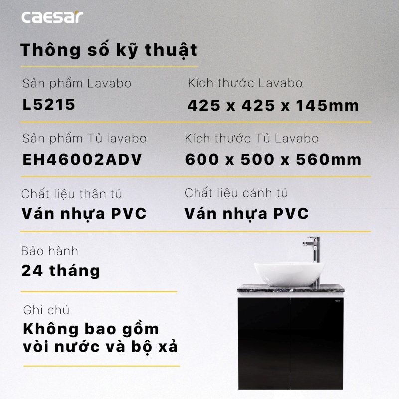 - Nâng Tầm Đẳng Cấp Không Gian, Khẳng Định Phong Cách Gia Chủ: Tủ lavabo PVC Caesar L5215/EH46002ADV sở hữu khả năng biến phòng tắm từ một không gian chức năng đơn thuần trở nên đặc biệt, sang trọng và “có gu”.