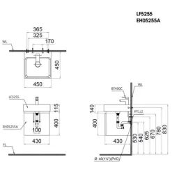 - Kích thước lavabo LF5255 : 450 x 450 x 115 mm (rộng x dài x cao)