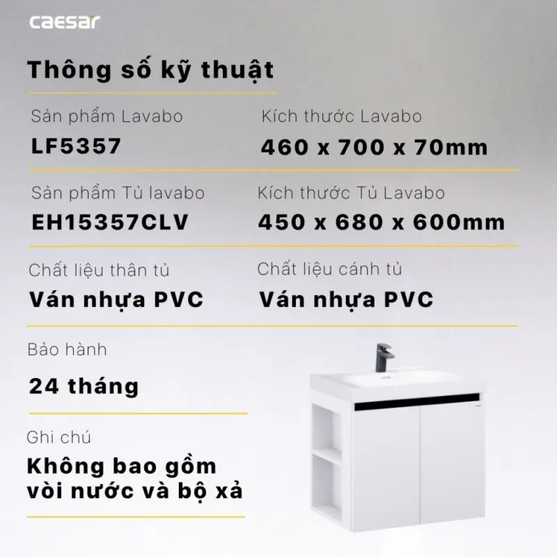- Mọi thông số kỹ thuật của tủ lavabo treo Caesar LF5357/EH15357CLV đa năng mang tính khách quan có thể có sai số của công cụ đo lường.