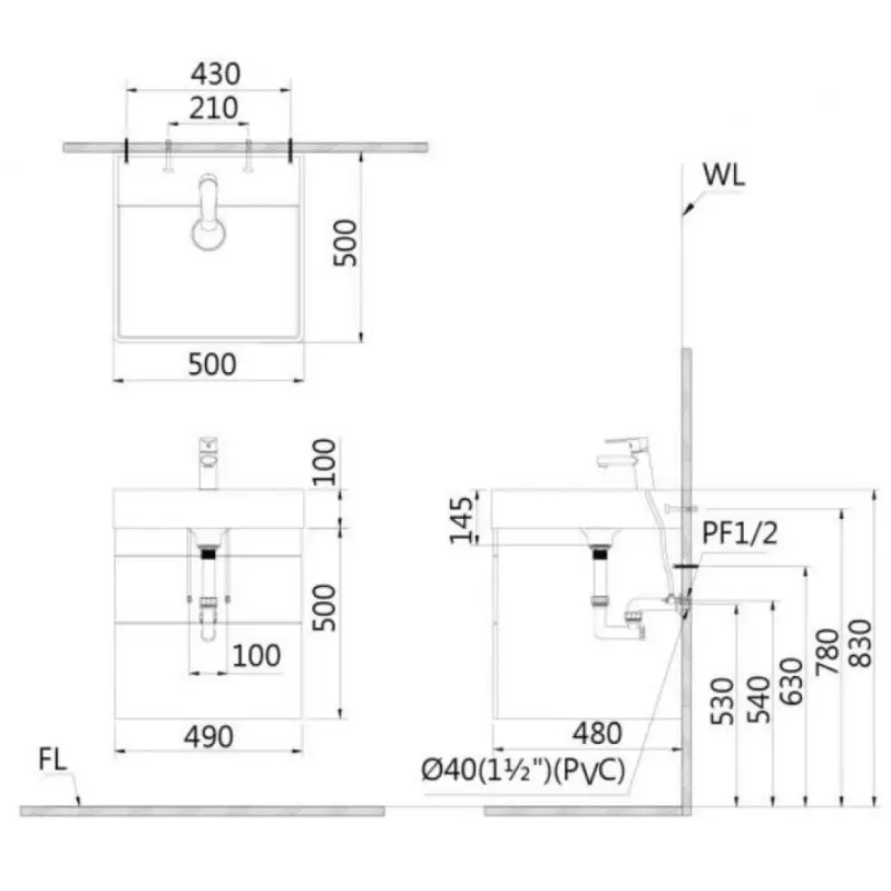 - Kích thước lavabo LF5380: 500 x 500 x 100 mm dài x rộng x cao)