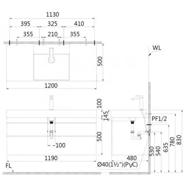 - Kích thước lavabo: 500 x 1200 x 100mm dài x rộng x cao)