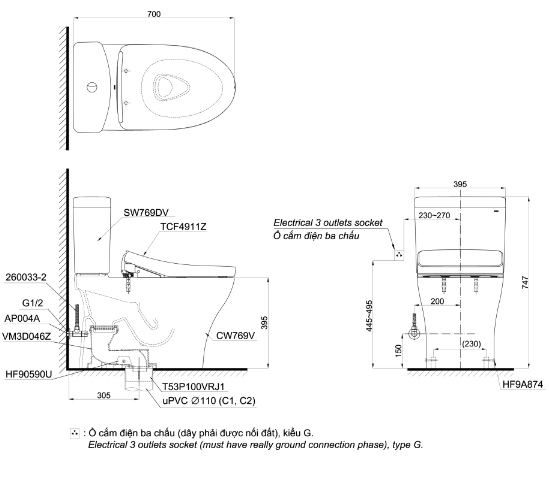 Bồn cầu 1 khối kèm nắp rửa điện tử TOTO CS769DRW11