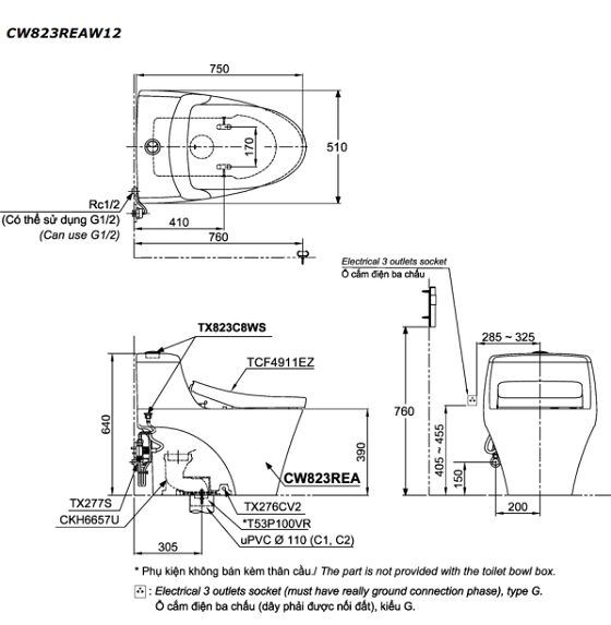 Bồn cầu 1 khối kèm nắp rửa điện tử TOTO CW823REAW12