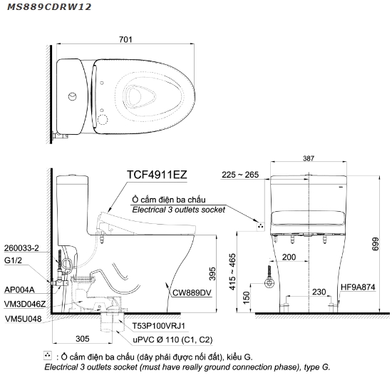 Bồn cầu 1 khối kèm nắp rửa điện tử TOTO MS889CDRW12