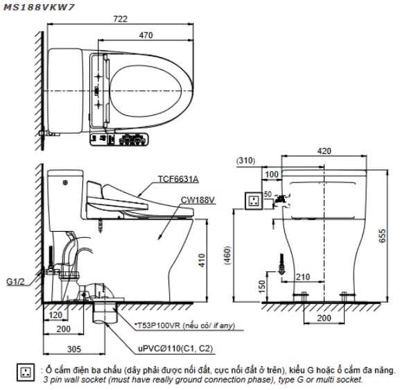 Bồn cầu 1 khối kết hợp nắp rửa điện tử TOTO MS188VKW7