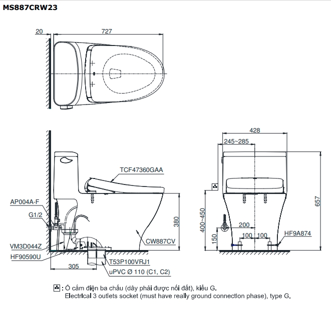 Bàn cầu 1 khối kèm nắp rửa điện tử WASHLET dòng S7 – TCF47360GAA