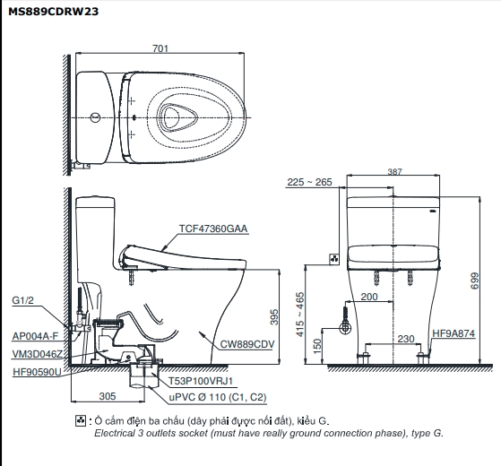 Bồn cầu 1 khối nắp rửa điện tử Washlet S7 TOTO MS889CDRW23 (giấu dây)