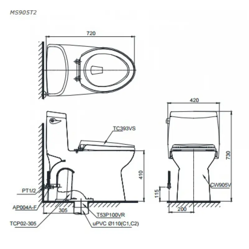 Bồn cầu 1 khối TOTO MS905T2 nắp TC393VS